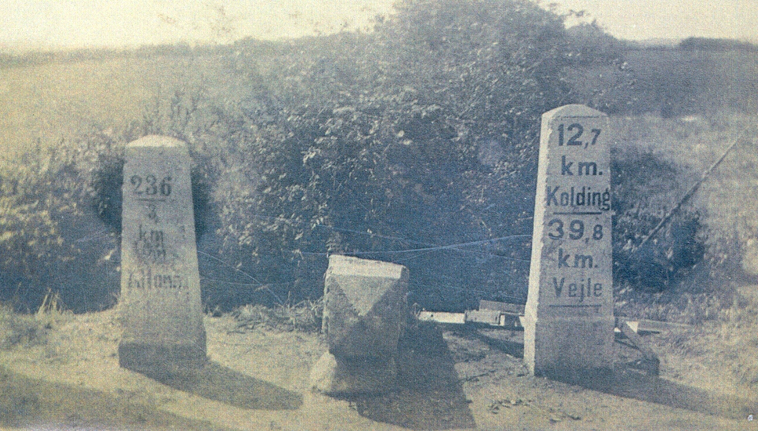 For ikke l├ªnge siden fik vi mulighed for at f├Ñ kopi af nogle privatfotos fra 1920 hos et st├©ttemedlem. Et af disse er ganske specielt. Det viser spidsen af en v├ªltet gr├ªnsesten – formentlig lige p├Ñ det sted, hvor 1864-1920 gr├ªnsen havde sit forl├©b. Ved siden af – mod nord – en sten, der viser, at der er 12,7 km til Kolding og 39,8 km til Vejle. Mod syd en sten, der viser, at afstanden til Altona ved Hamborg er 236,3 km.
